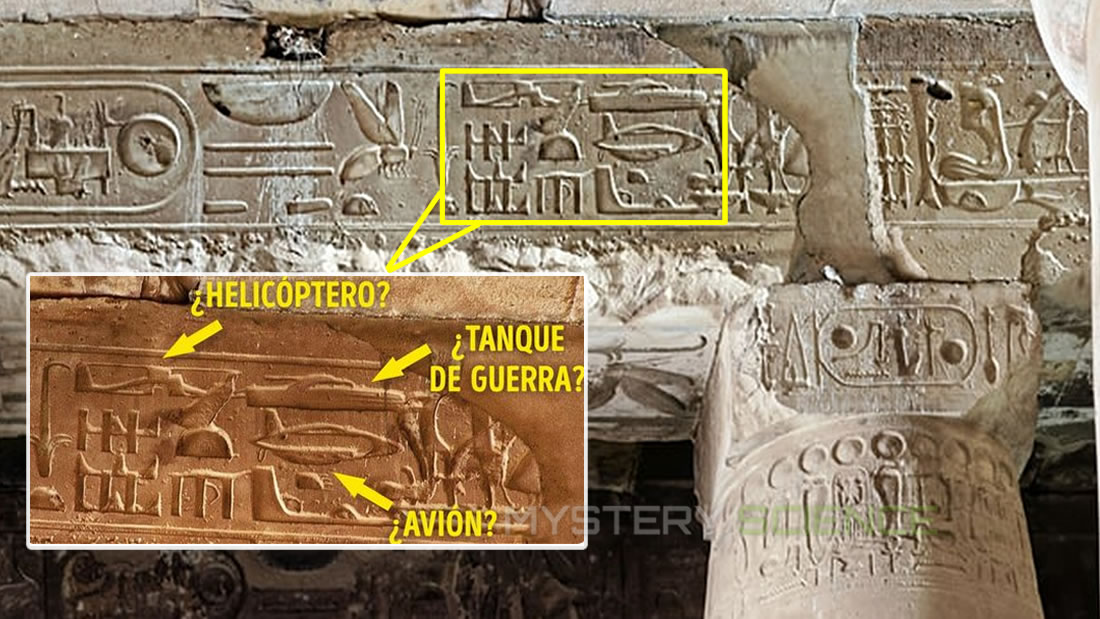 En el templo de Seti I llama poderosamente la atención lo que se conoce como las ‘tallas de Abidos’, entre jeroglíficos tradicionales del lugar pueden encontrarse tallados de lo que parece ser un helicóptero, además de aviones, naves futuristas y hasta un submarino.