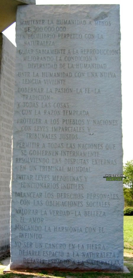 Las cuatro losas ubicadas de forma perpendicular al suelo tienen un mensaje escrito en sus 8 caras, en 8 lenguajes diferentes. Estos idiomas son el inglés, español, suajili, hindi, hebreo, árabe, chino antiguo y ruso. La piedra superior también tiene un grabado, pero esta vez en cuatro idiomas antiguos: griego clásico, sánscrito, jeroglíficos egipcios y escritura babilónica cuneiforme.